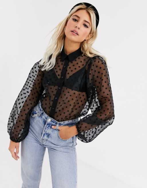 Black mesh store polka dot top