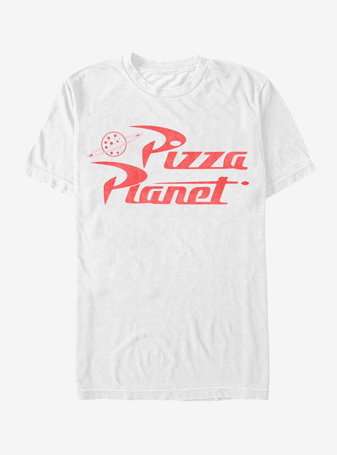 Red pizza planet store shirt